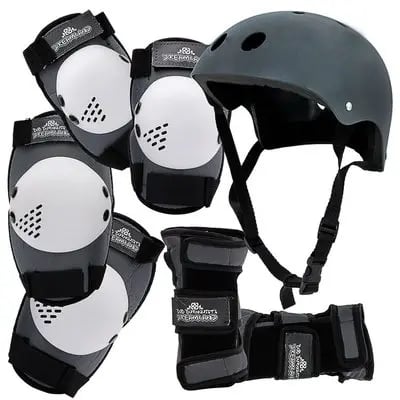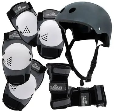 Capacetes protegem contra impactos na cabeça, joelheiras e cotoveleiras ajudam a evitar machucados nas quedas, e protetores de punho previnem fraturas e torções.